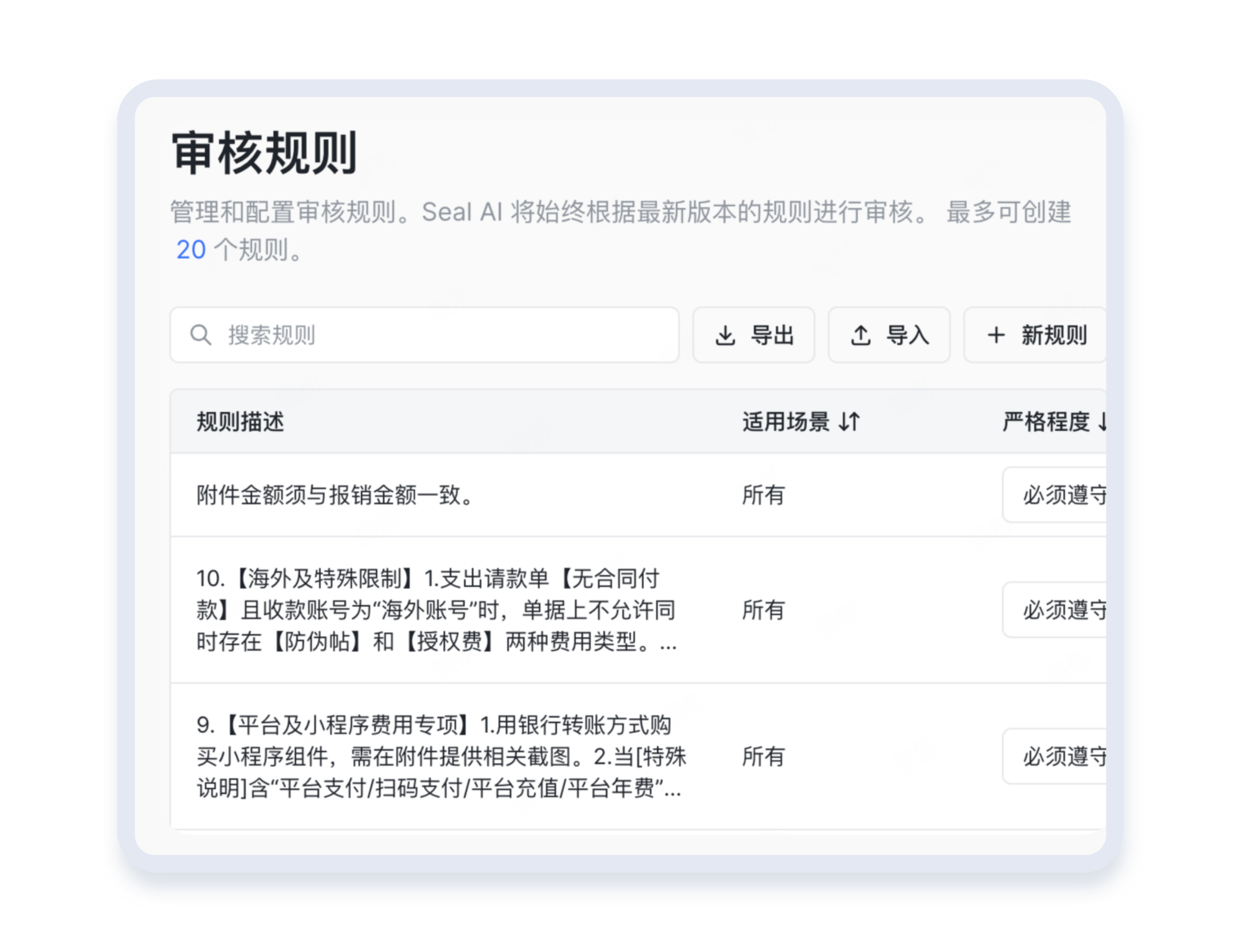 企业历史审核规则可一键保存、跨部门 / 分支机构导入导出,不用重复配置,核心审核经验轻松沉淀、高效复用