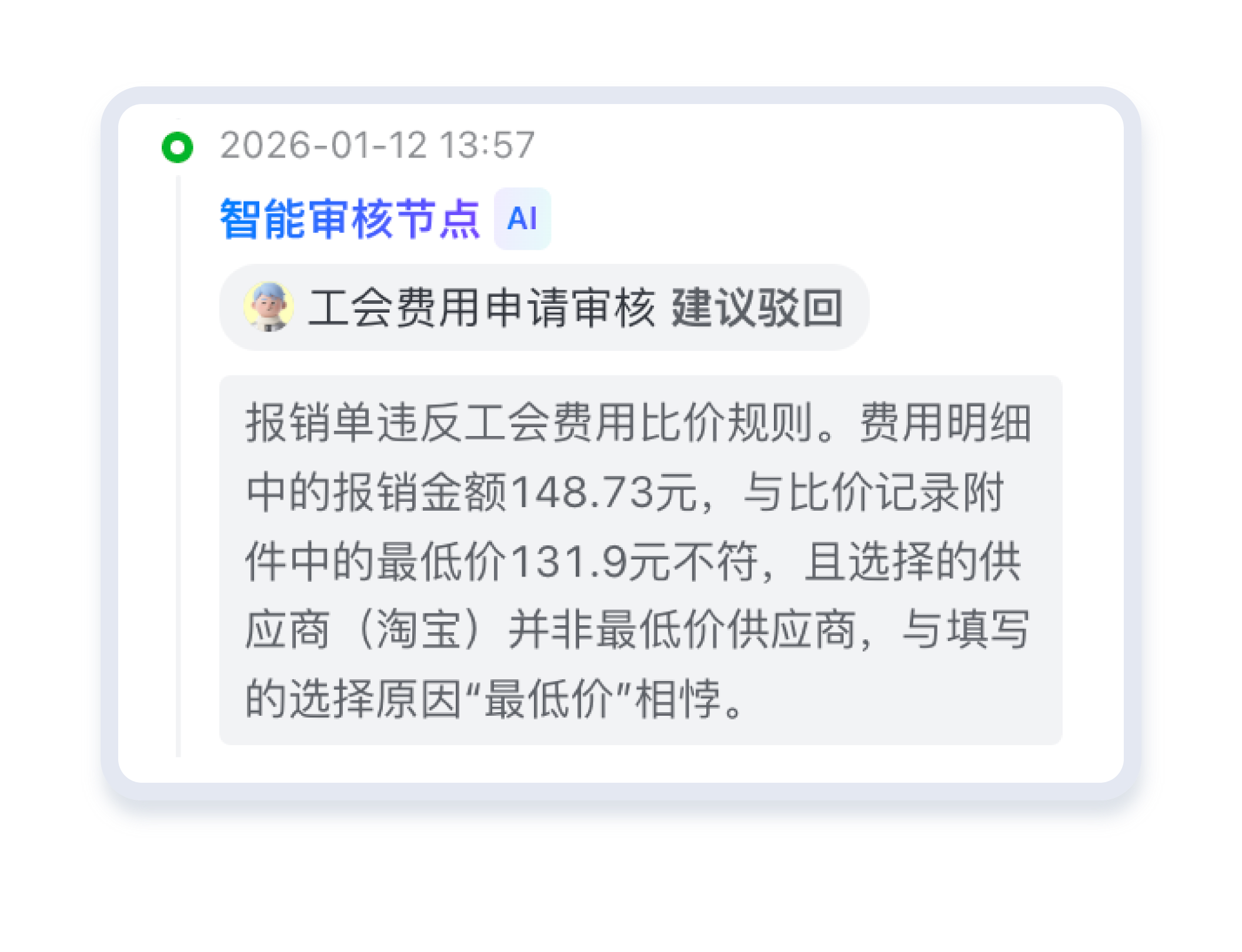 “合思 AI 财务审核专家落地后,我们实现了从单据堆找问题到聚焦决策价值的转变,财务审核重点从 “大而全” 转向 “关键点”,真正释放了财务团队的价值。”