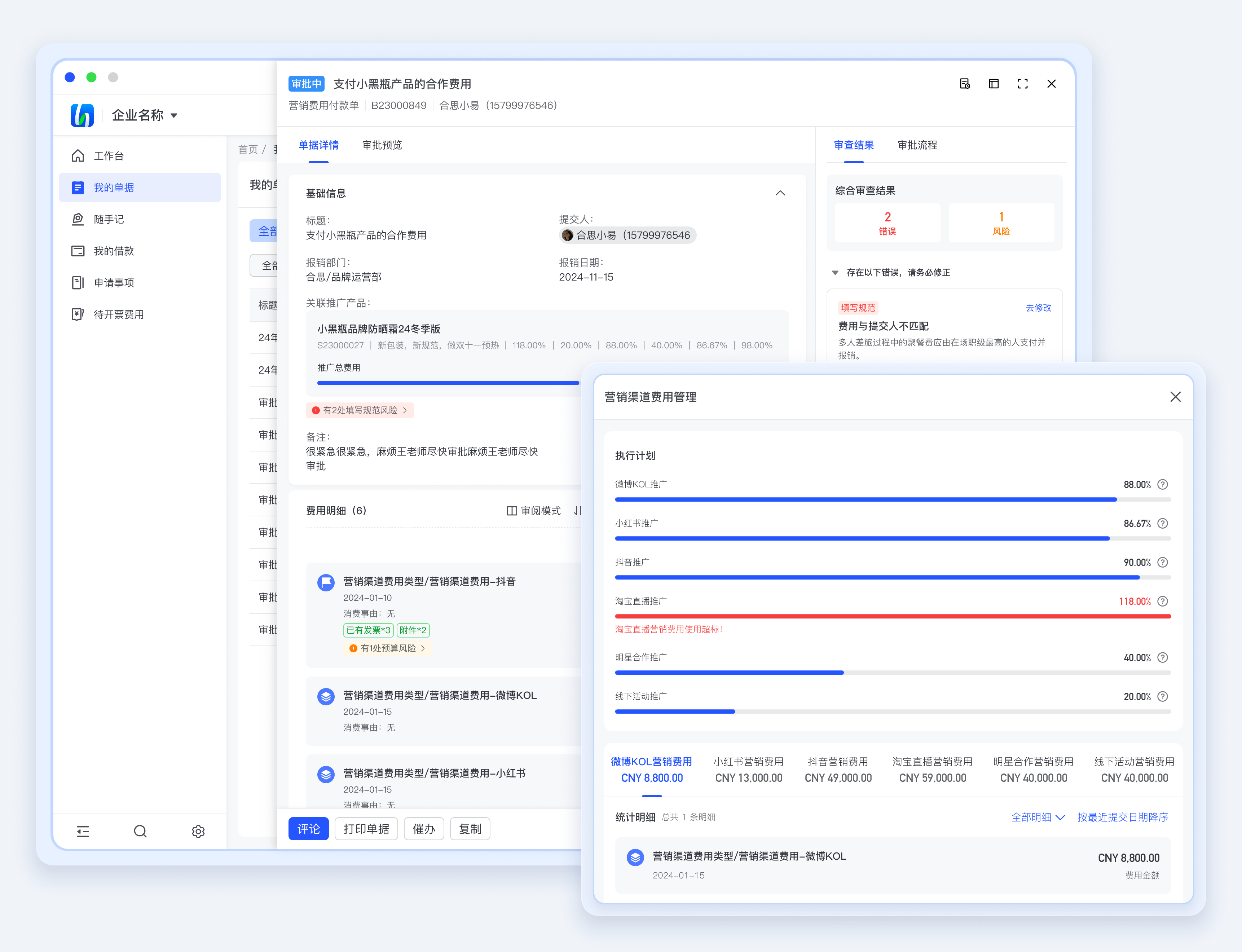 合思费控通过企业消费商城+易商卡覆盖因公消费全场景,打通交易、费控报销与存档等多个割裂的系统 ,率先实现“申请、消费,报销,对账、记账、归档、报表”的全流程数字化费控管理,差旅、用车、餐饮、办公采购等多场景消费数据自动采集、自动流转,发票可识别验真,费用支出合规、透明、可追踪,助力企业降本增效、合规经营。