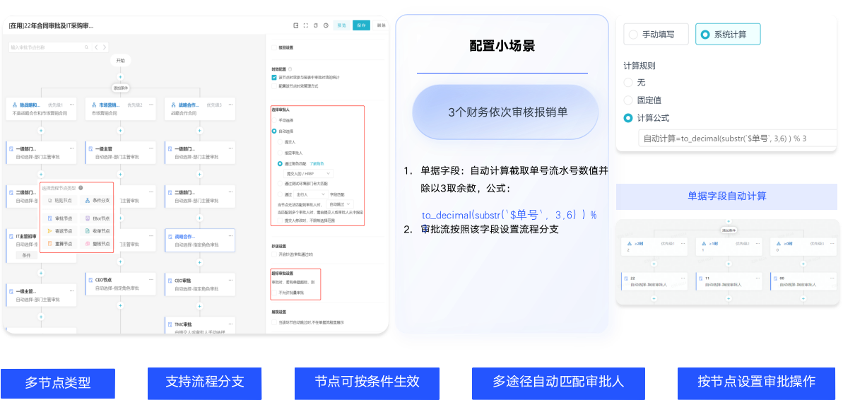 通过新增/删减流程节点并支持流程分支,节点可按配置条件生效,实现多途径自动匹配审批人,个性化审批操作一触即发。