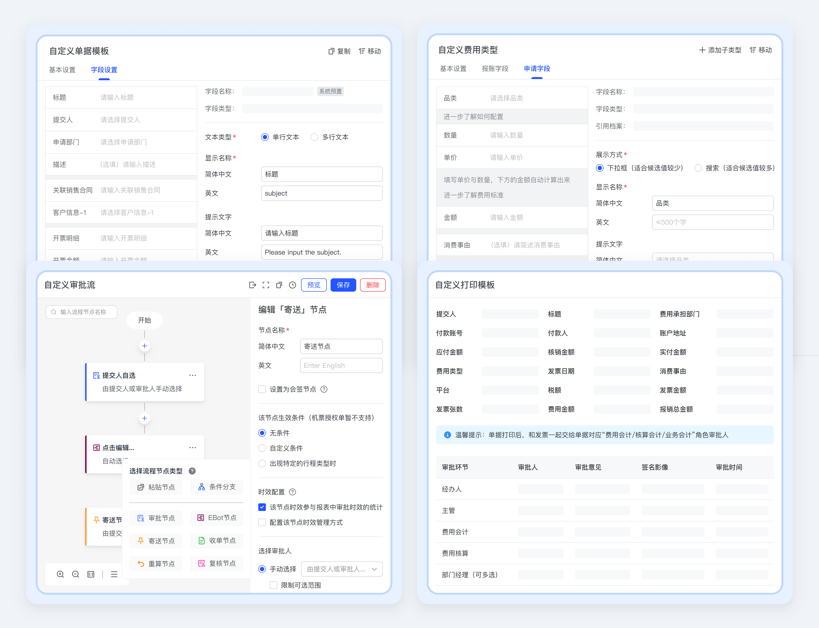 支持单据、费用、审批流的个性化配置,系统智能分析审批流程,自动化驱动,适应企业多级授权要求,支持企业高速发展与组织变革