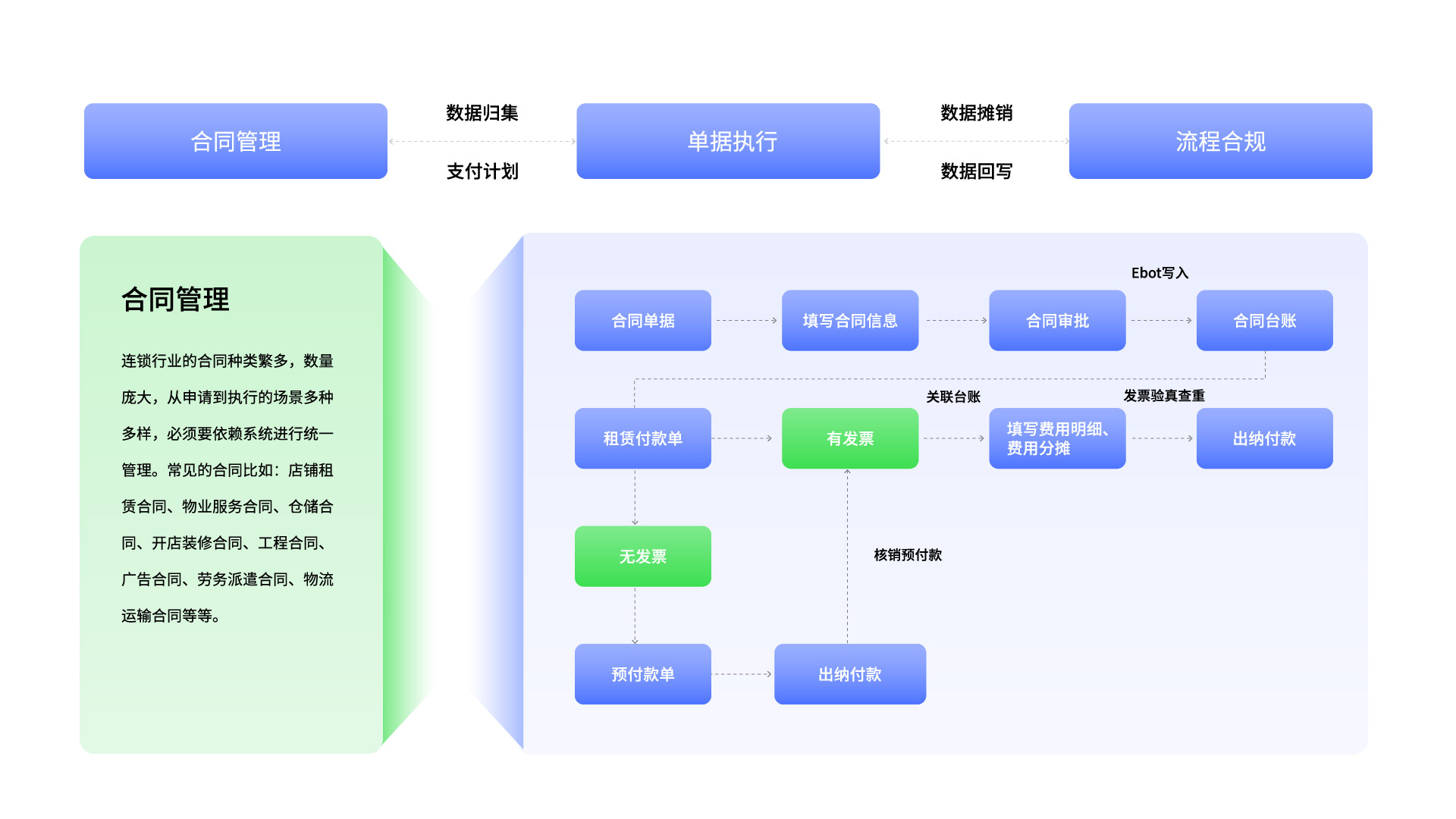 通过合思,实现门店管理线上化,对公业务支付更安心,合同费用等实时统计追溯,建立更规范的集团财务管理制度。