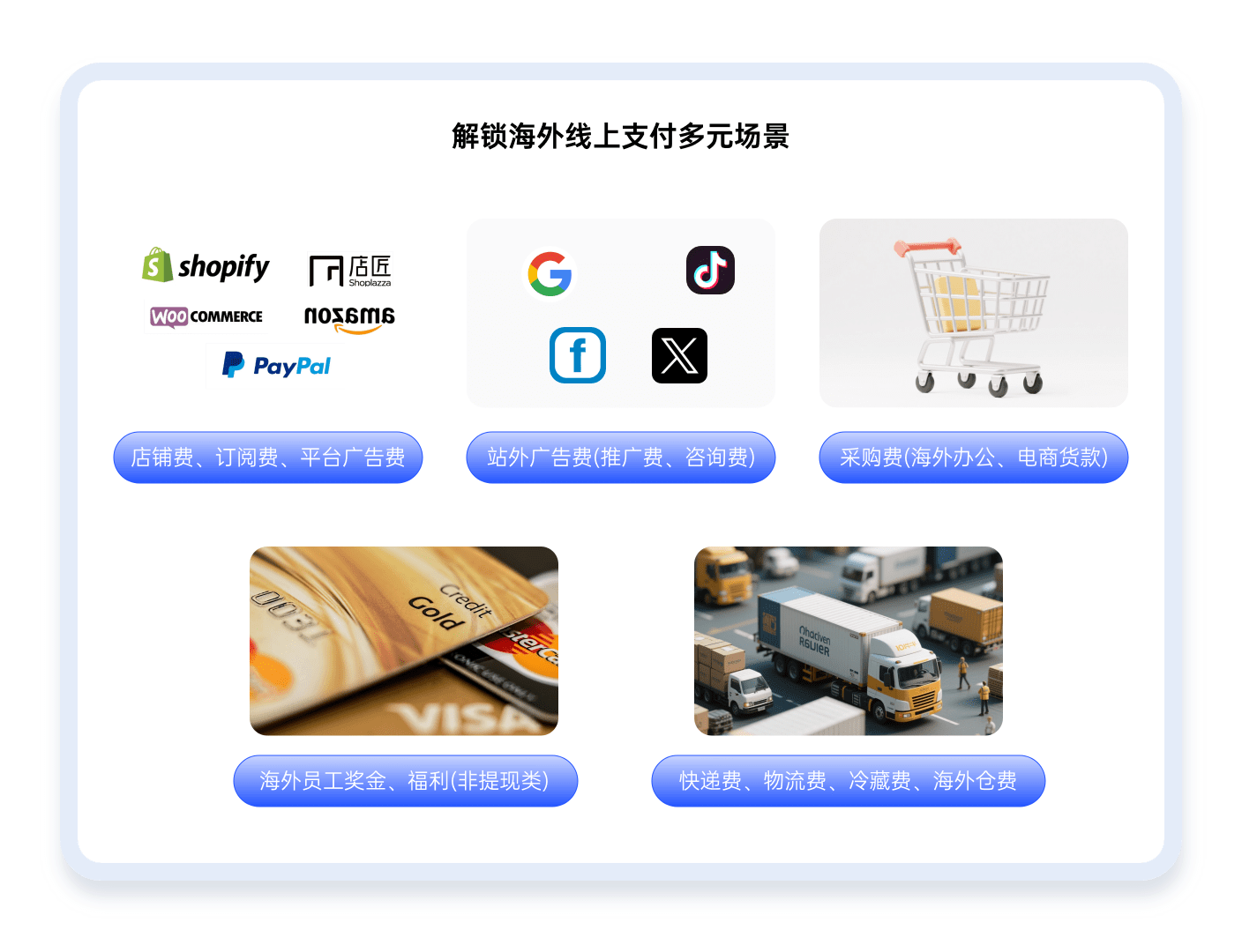 • 易商卡助力海外线上支付,可用于支付电商平台店铺费、订阅费、广告费,站外推广咨询费,海外采购款及员工非提现福利等。
