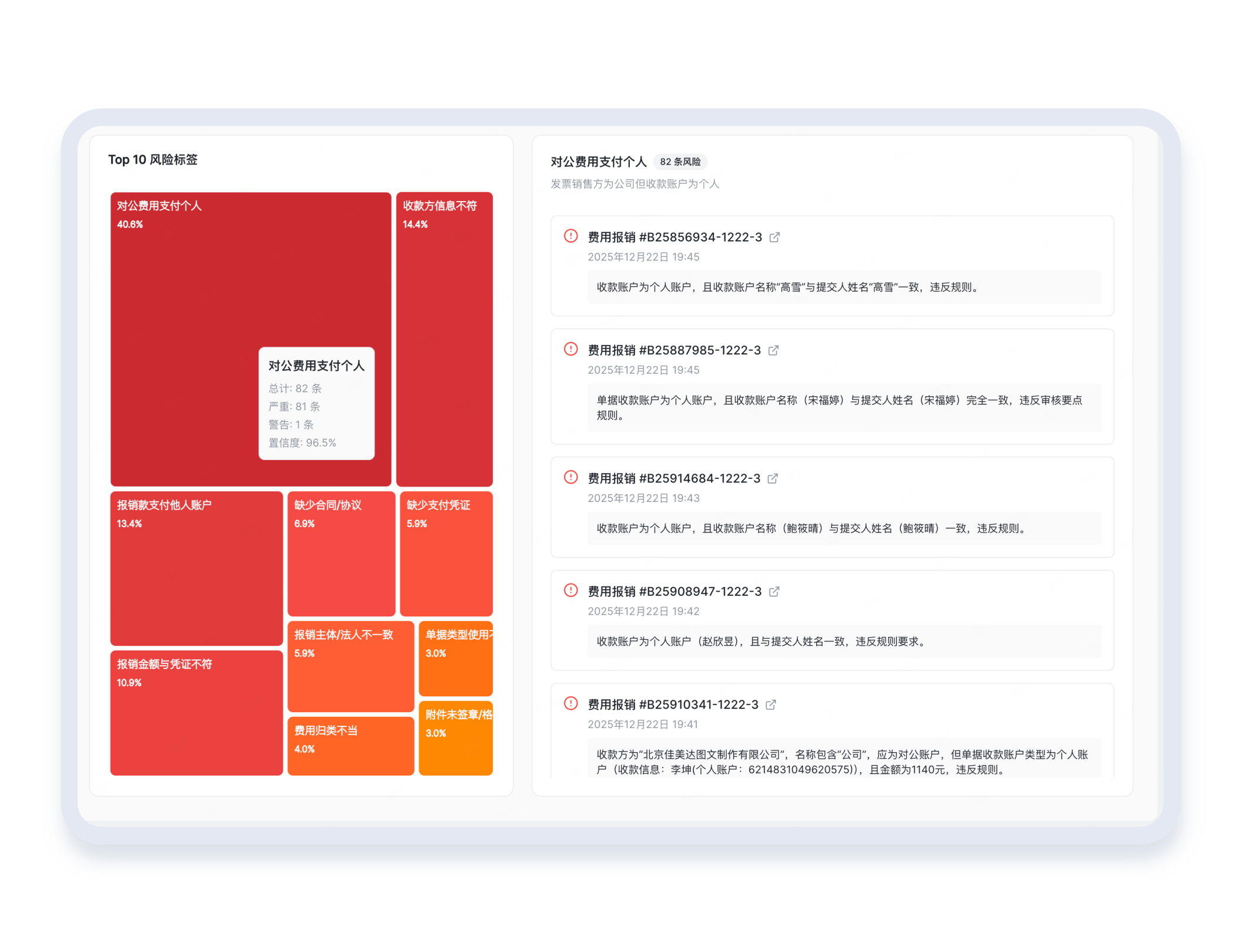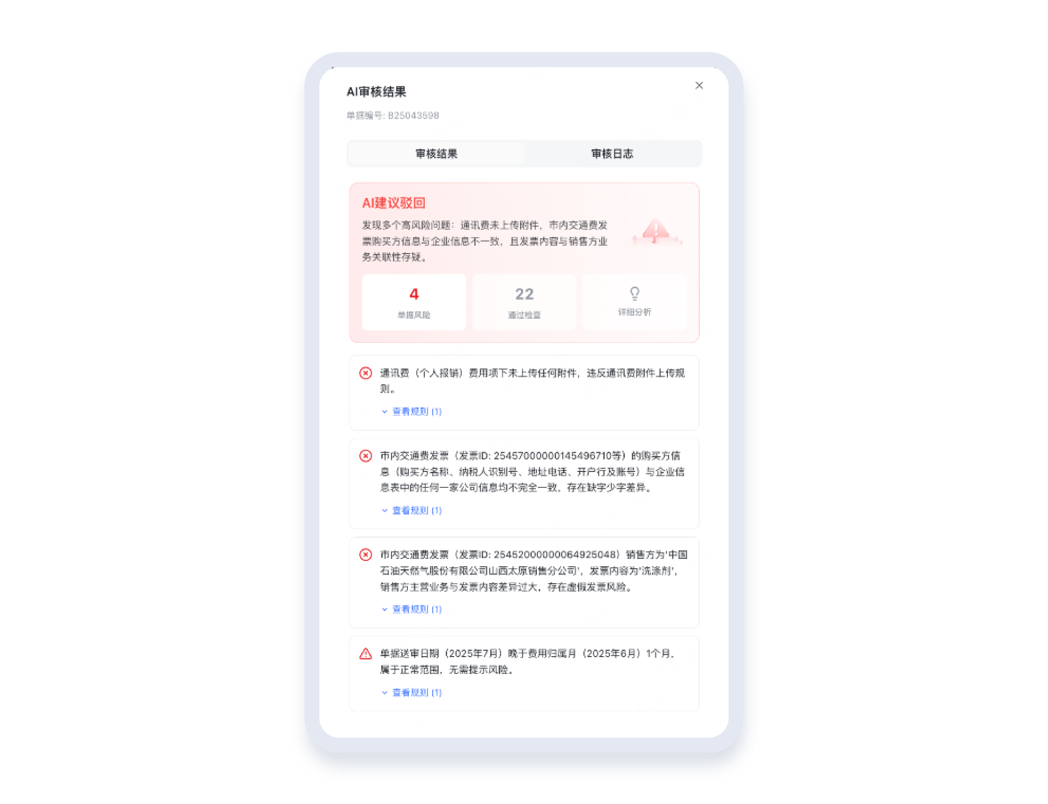 审核结果不搞模糊化,风险点、违规依据、处理建议一目了然,分级标注、全程可溯,财务跟进处理更高效,不用再反复核对确认