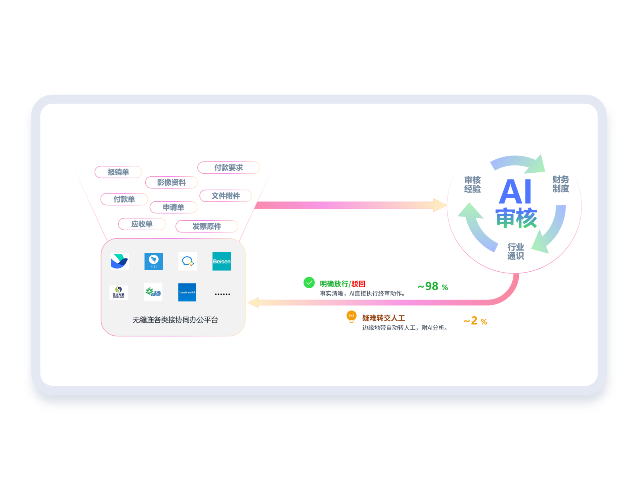 AI 不做最终决策,仅针对所有单据输出专业分析建议和风险提示,最终审批结果由人工决定