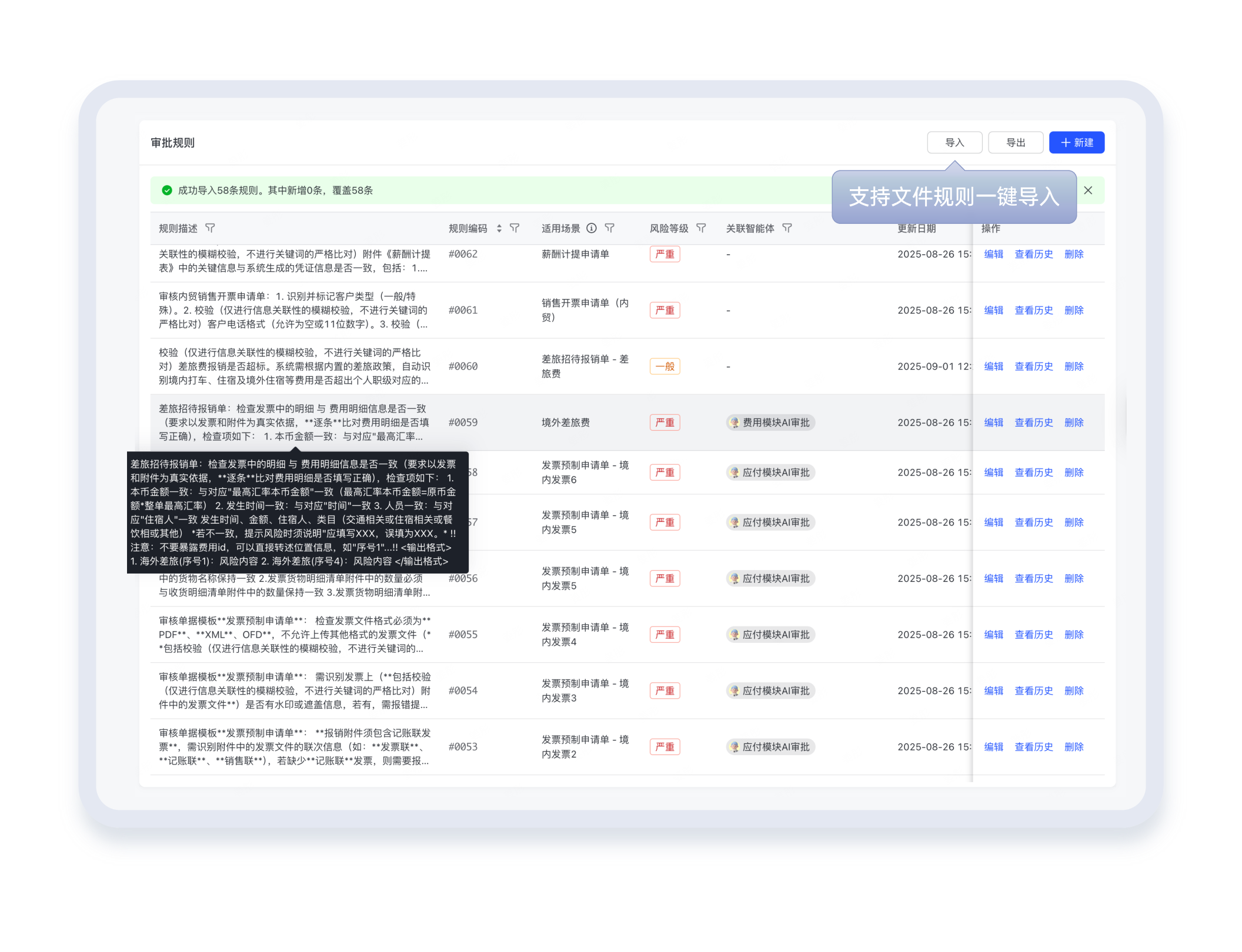 企业历史审核规则可一键保存、跨部门 / 分支机构导入导出,不用重复配置,核心审核经验轻松沉淀、高效复用