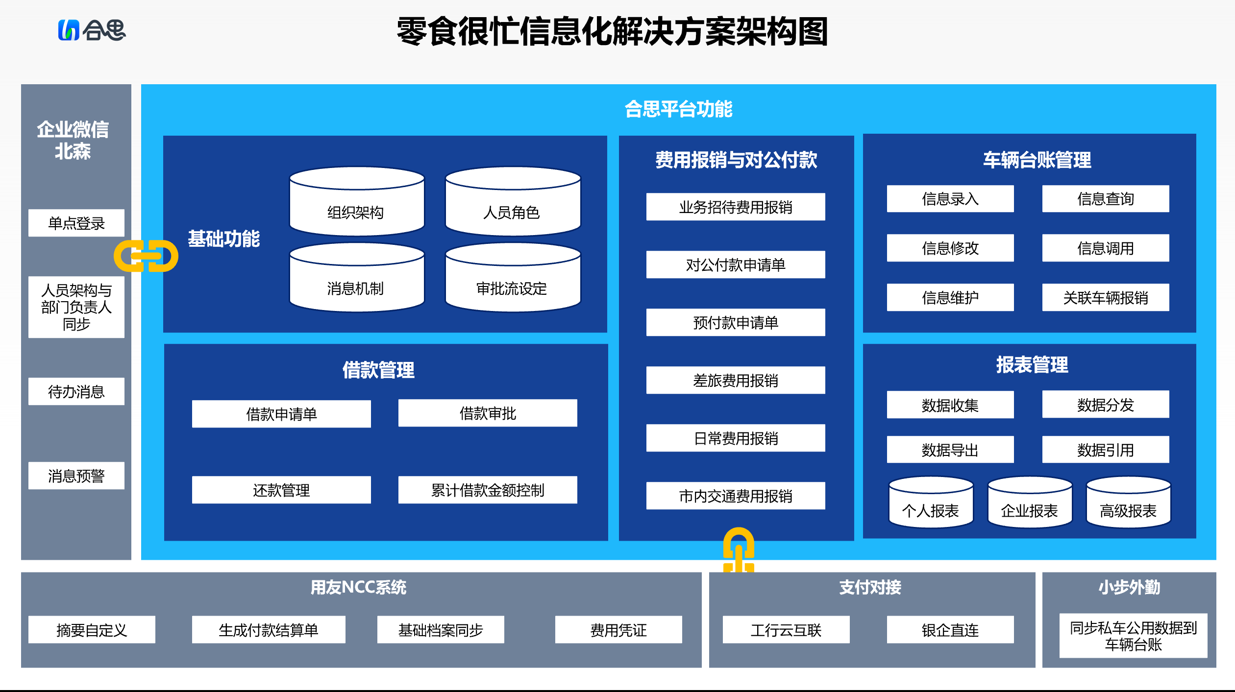 了解 合思费控>业务高速发展,企业引入较多信息化系统。企微、北森、用友NCC各个系统有自己的数据体系,相互间缺乏联动。对于数据分析、财务做账来说非常困难。