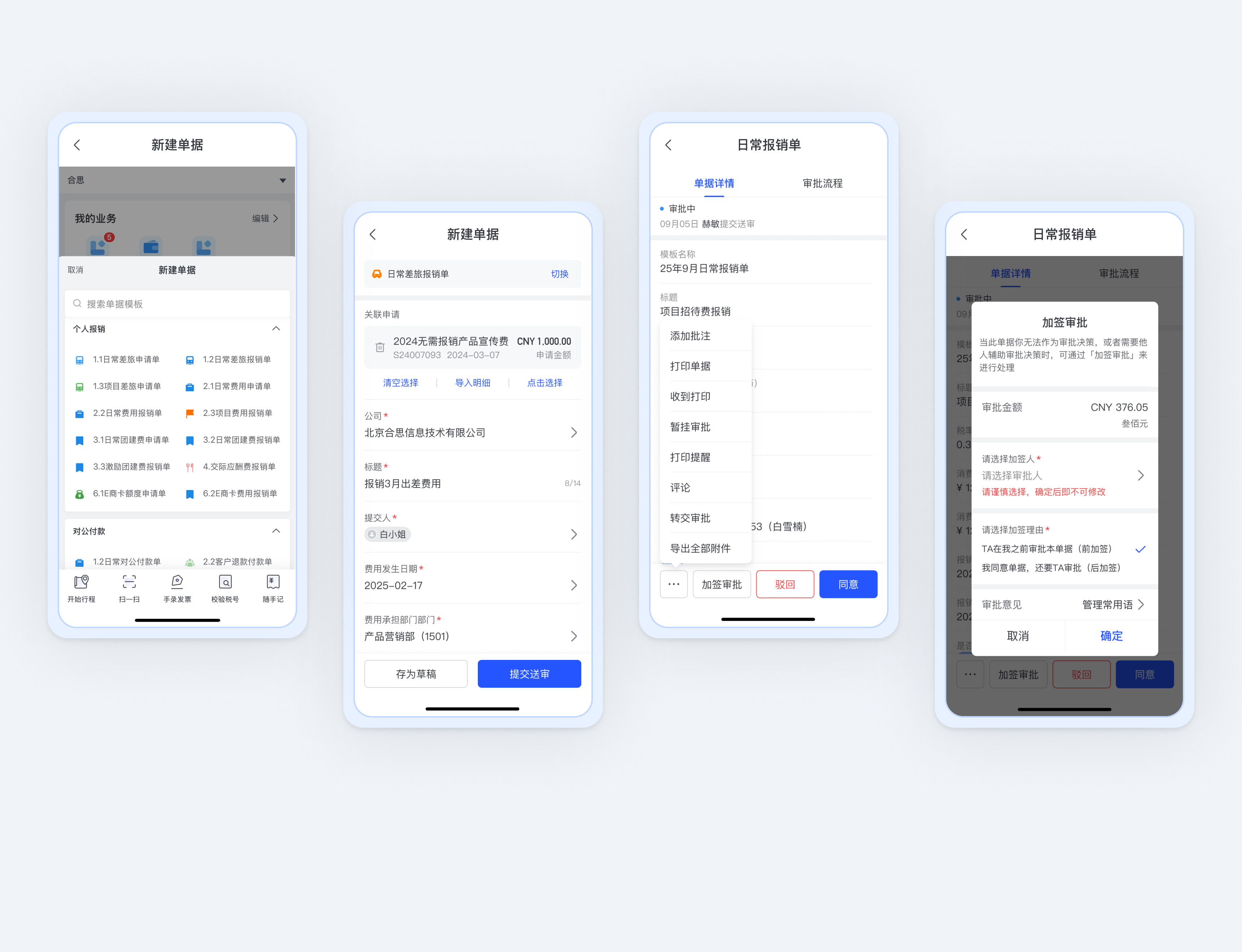 移动端申请、借款、报销。标准化流程+引导式填单,节约员工时间成本;多种审批方式,满足企业个性化需求