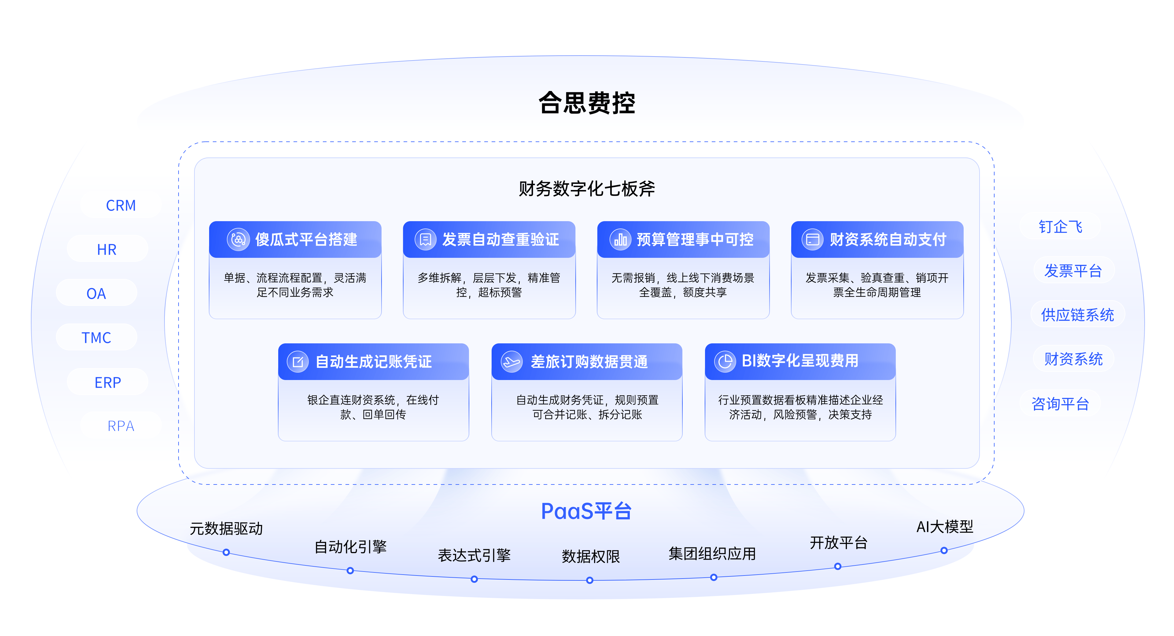 合思费控通过企业消费商城+易商卡覆盖因公消费全场景,打通交易、费控报销与存档等多个割裂的系统 ,率先实现“申请、消费,报销,对账、记账、归档、报表”的全流程数字化费控管理,差旅、用车、餐饮、办公采购等多场景消费数据自动采集、自动流转,发票可识别验真,费用支出合规、透明、可追踪,助力企业降本增效、合规经营。