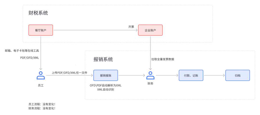 通过上述流程可得知,数电票政策下,企业只要使用适配了政策的系统,员工和财务可以做到无感。